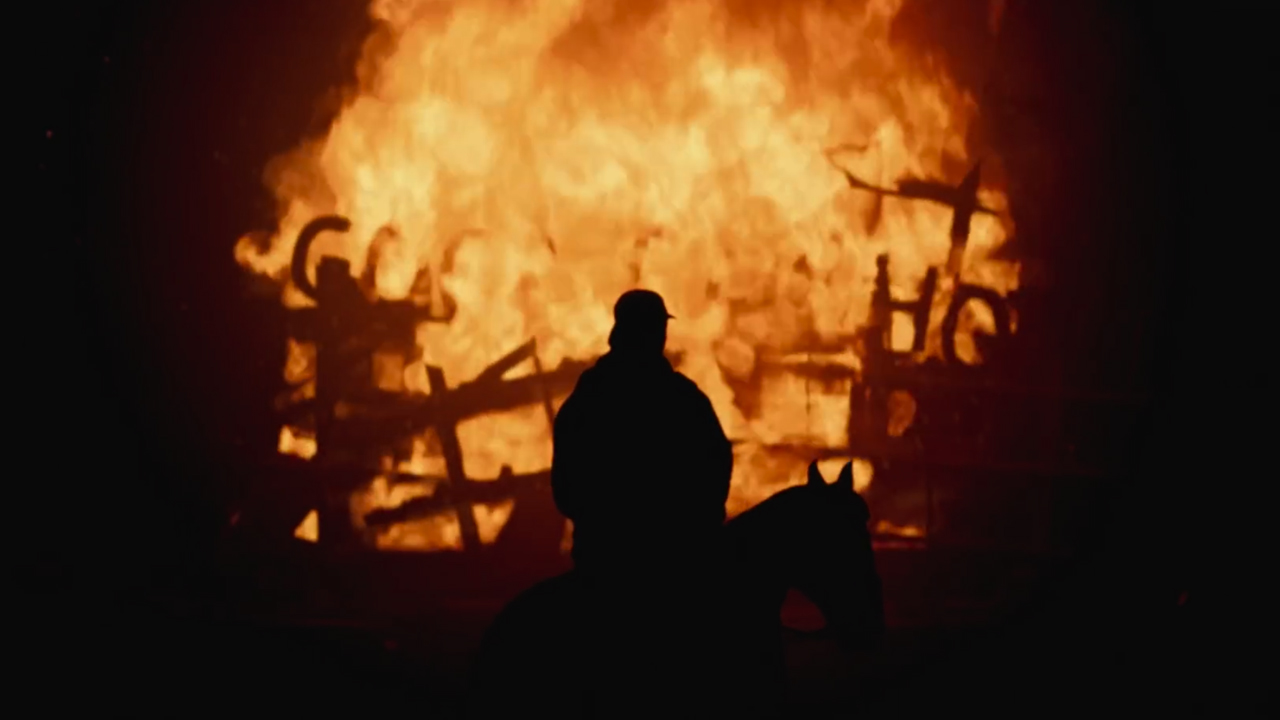 If music can sonically capture the feeling of vulnerability and determination, then the music video for ‘Keepsake’ visually mirrors the emotional push and pull of stepping into the unknown. Following on from his previous single and in continuum with his 2023 album, ‘Good Time Hotel,’ Dugong Jr opens the video with a striking image of the Good Time Hotel engulfed in flames – its glowing red signage collapsing as a lone figure sitting on a horse watches from afar. The burning hotel becomes a powerful symbol of release and rebirth, setting the tone for the journey that follows. As the camera moves directly into the eye of the horse, we’re transported into the surreal world of the music video, blurring the line between reality and dream. The surrealness was awakened by the sophisticated directorial work of Jaydan, who recounts: