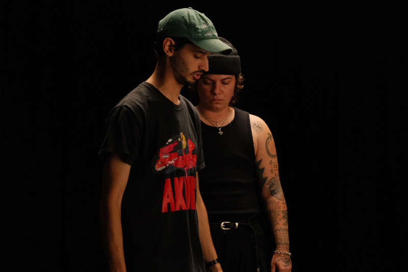 The achievement of the visuals draw inspiration from the likes of David Lynch‘s surreal world depicted in ‘Twin. Peaks’, to the bold imagery of the anime-classic ‘Akira’, as well as the technology-influenced advertising of the millennium era. For Jaydan, ‘Akira’, in particular, was an important visual reference that informed the imagery of the hotel burning, but also the illusion of mirrors. In a striking sequence during the song’s bridge, Dugong and Georgi appear in parallel close-ups, their faces framed by mirrors that blur the boundary between reality and illusion. The image implies perhaps, a struggle between the internal and external self, suggesting a conversation between two fragmented selves, each caught between connection and disassociation. The lyrics, “Flashing light, hits my phone” reinforces this, as red lights cast over the covert blue light filter. Elaborating further on what it took to achieve this visuality, Jaydan singles out these influences, whilst also praising the work of cinematographer, Ryan Bell: