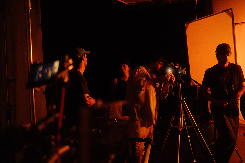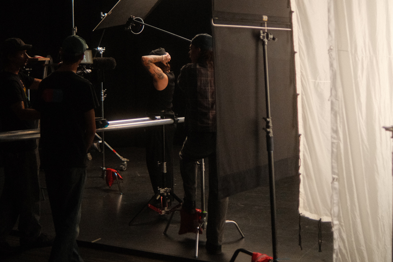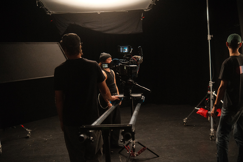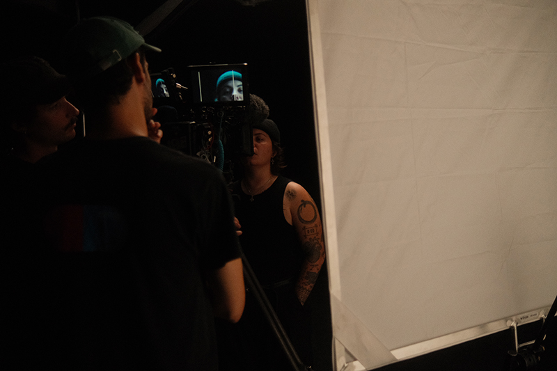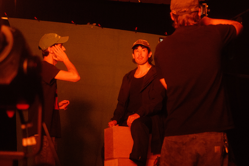 “[…]The arpeggiator that starts the song and carries through is so strong and “synthetic” it felt important to translate that visually. We grabbed four other cameras and had them placed around the artist to capture this bullet time effect to match the arpeggiator, creating this shaky distortion. The editor Liam James, spliced all four cameras together to create this effect and played around with it to mix both artists together as well. We have worked together on every single project so there is this unspoken understanding between the both of us for most of the time, and always keeps me surprised with the edit.”