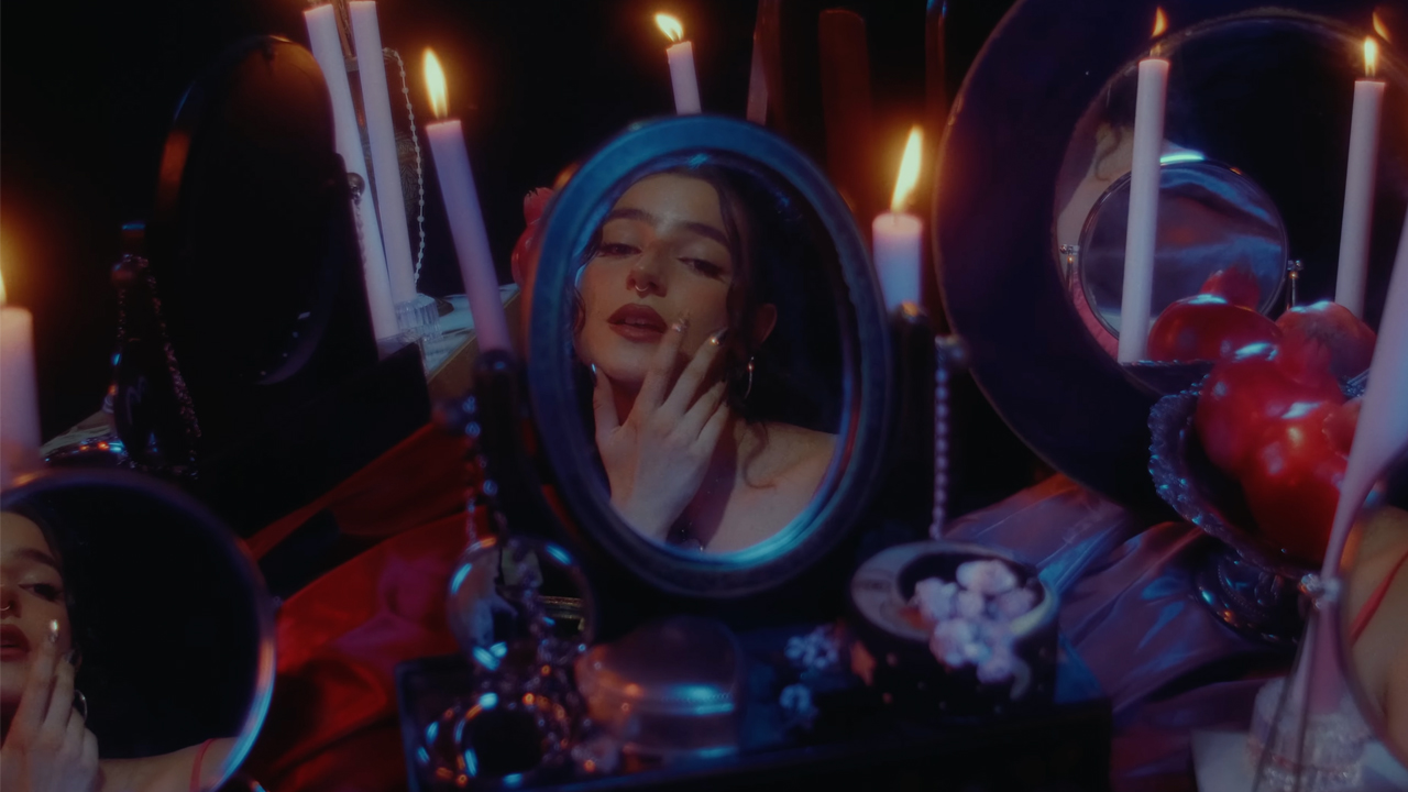 With such evocative references to classic horror cinema, it’s easy to get swept up in the leading impact of the visuals, with the filmmakers enchanting viewers much in the same way an apparition or witch hexes unassuming commonfolk. One clear point of inspiration appears in the use of close-ups, isolating parts of the performers’ faces. In the visual’s opening moments, Zoe’s eyes, lit up in a cool blue, float in the sky like the moon. Much like the iconic red lips that open The Rocky Horror Picture Show, such extreme close-ups create a strange kind of intimacy. We see one part in sharp detail without any sense of the whole person, immediately establishing a surreal, unsettling tone. This bleeds into the later clips, where quick flashes of the performers’ faces—Zoe bathed in a moonlit blue, effie in Suspiria-esque red—disorient the viewer, creating that intoxicating feeling of passion and vulnerability. When one becomes so wrapped up in another, you become completely transfixed and immersed. The space surrounding the performers also reflects this. The set is minimally dressed with a bed, unfussy red satin sheets and a TV showing static— completely disconnected from the outside world. This is only further heightened by the use of the black void set. When it came to setting up these shots Mayah expanded on this, saying: